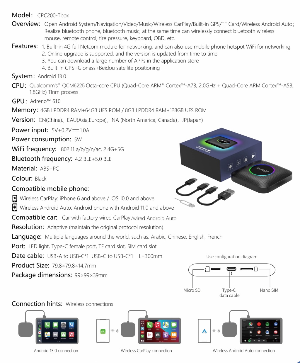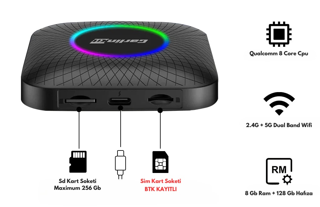 Carlinkit Tbox ( Max ) Ambient Android 13 AI Box’tır ve aracınızın kablolu CarPlay veya Android Auto sistemini en son Android 13 işletim sistemine çevrilmesini sağlar. Üstelik Kablosuz olarak Telefonuzun Apple Carplay veya Android Auto Kullanma İmkanı Sunar.