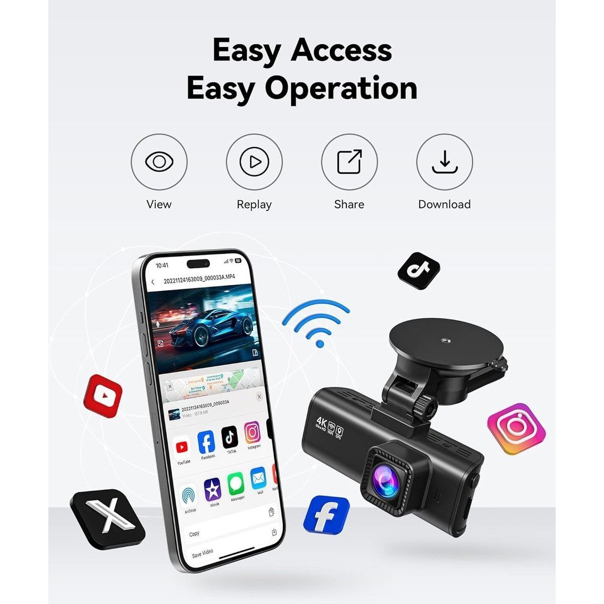 Dash Cam, 4K/1080P Çift Kamera, Wi-Fi, Gps, Gece Görüş, 170° Geniş Açı